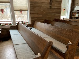 Below are a few photos after our renovation/restoration project in 2018.  Very little work had been done since the 1960’s and it was in need of some love and attention.  The floors, ceiling, beams, and pews are all original to when the church building was first erected!